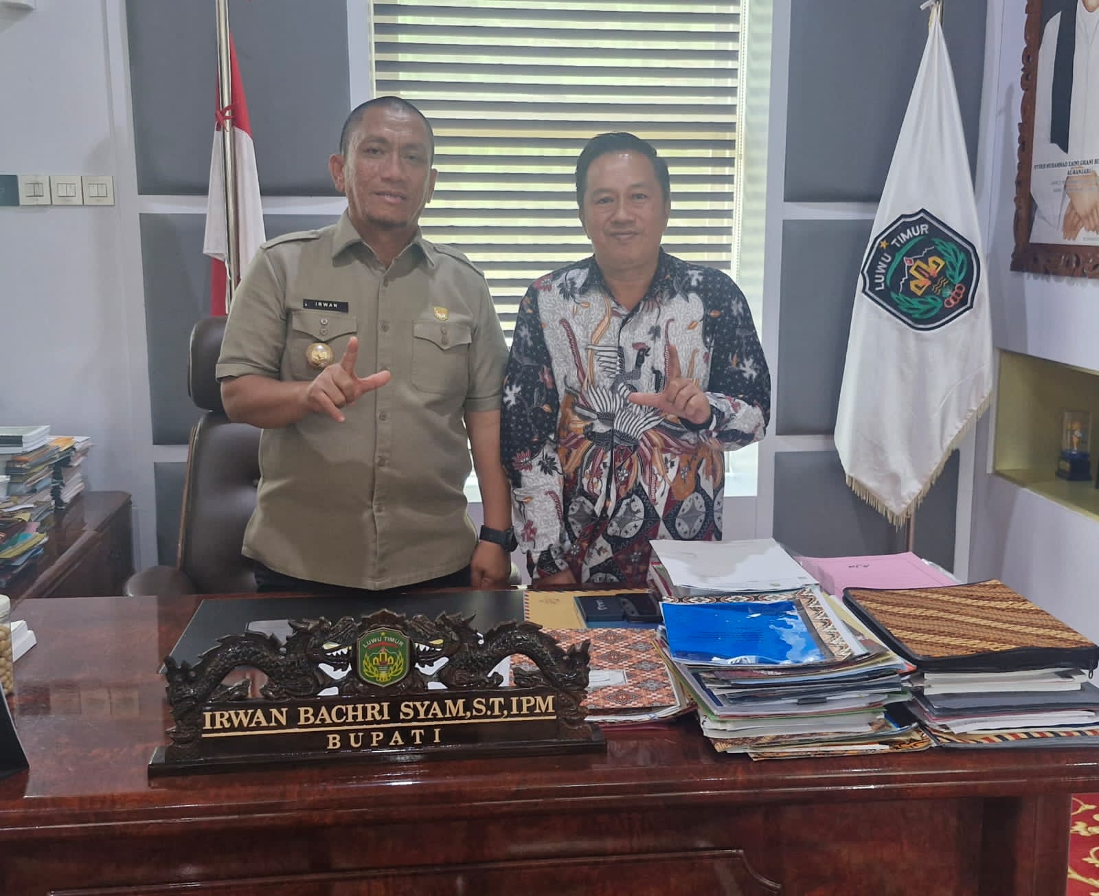 Kepala Kantor Kemenhaj Kabupaten Luwu Timur, Akhwan, melakukan silaturahmi sekaligus koordinasi dengan Bupati Luwu Timur, Irwan Bachri Syam, di ruang kerja Bupati, Jumat (9/1/26).